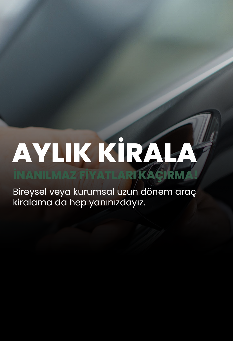 Hayalinizdeki araca ay boyunca uygun fiyatlarla sahip olmanın tam zamanı! En yeni ve en konforlu araçlarımızla sizi bekliyoruz. Ay boyunca sınırsız kilometre, tam kasko sigortası ve 7/24 yol yardımı gibi avantajlarla sizi ağırlamaktan mutluluk duyacağız.